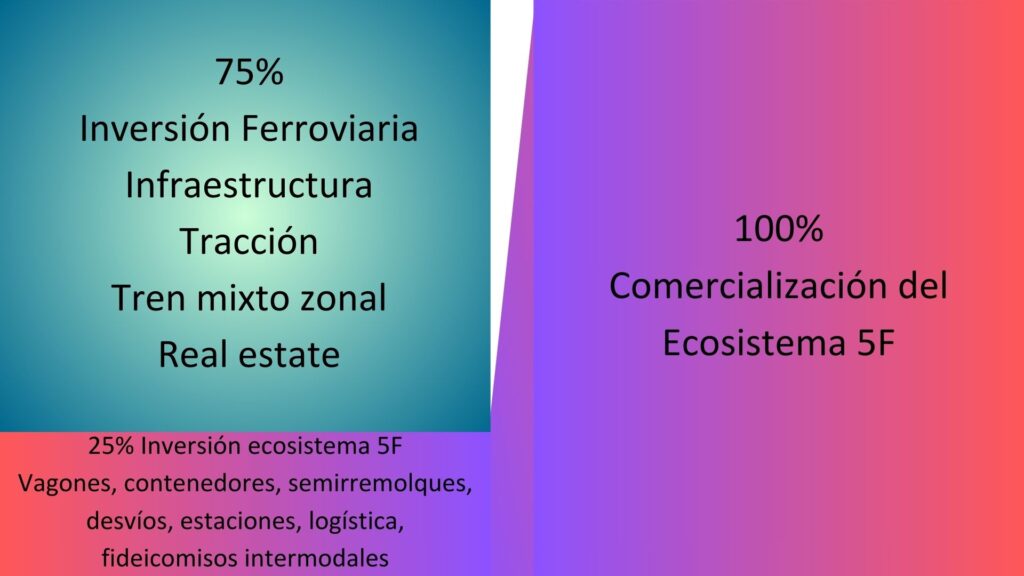 La inversión ferroviaria en el marco del Modelo 5F, se divide en un 75% para la infraestructura ferroviaria, la tracción, el real estate asociado y trenes mixtos zonales de pasajeros, mientras que el otro 25% corresponderá a las inversiones logísticas asociadas: Vagones, semirremolques, estaciones, desvíos, contenedores, fideicomisos de bodega, etc.