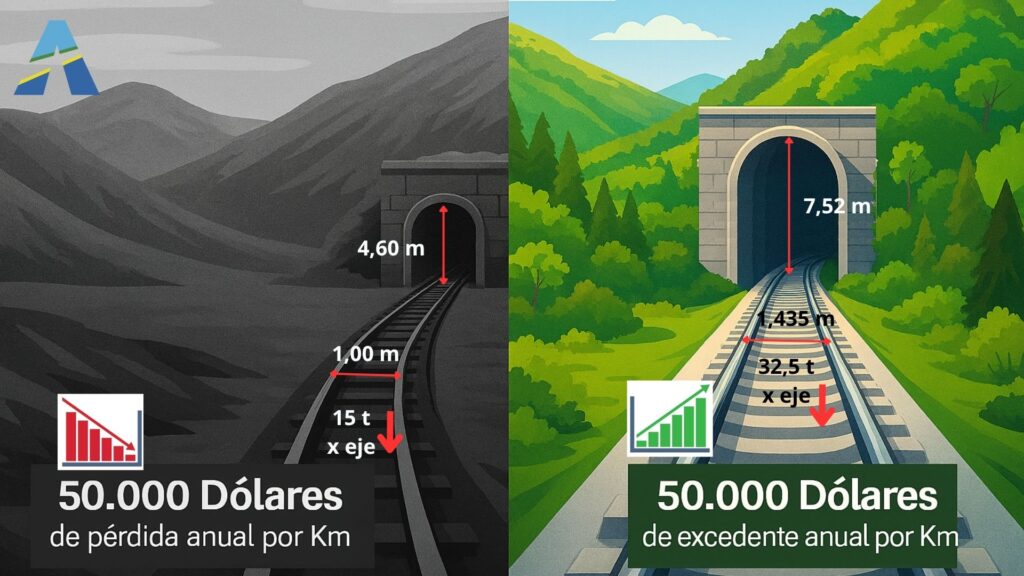 Por ejemplo, la movilización de 6.000.000 t anuales para cruzar a la Cordillera de los Andes a lo largo del Corredor Capricornio hacia Chile, con la minería de Argentina, más los graneles de Paraguay y Brasil, más los contenedores del mismo, requerirían U$S 50.000 anuales de subsidio por cada kilómetro de vías porque los vagones generarían rentabilidad negativa.