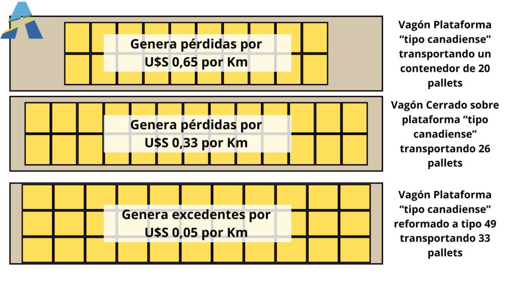 Al ensancharlo en 23 centímetros, lograron aumentar en un 27% la productividad por vagón. Aplicando el mismo criterio, y el mismo análisis particular (productividad del vagón) y general (productividad de la red), la imposición de nuevos vagones aptos para 45 pallets en un nivel y, si la carga y el peso lo permiten, hasta 90 pallets, ese vagón pasaría a proveer excedentes operativos de entre 0,69 y 3,10 dólares por cada kilómetro recorrido.